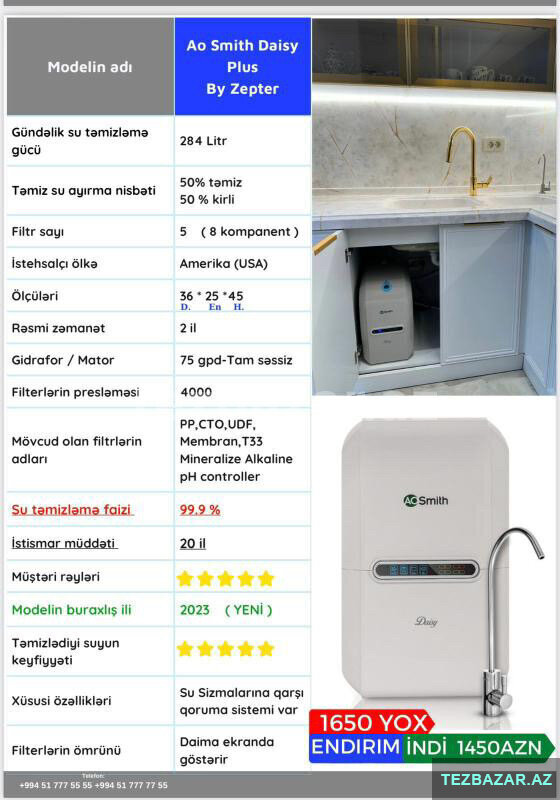 A.O. Smith su filtrleri, suyunuzda istənməyən kimyəvi maddələri, kirlilik və mikrobları 99, 9% oranında aradan qaldırır. Evinizdəki suyun keyfiyyətini artırın və sağlamlığınızı qoruyun!