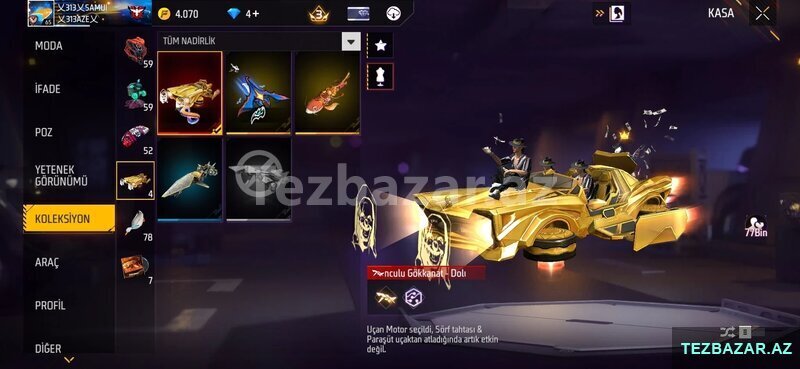 - Kolleksiya bölməsi: nadir uçan maşınlar, paraşüt və sörf taxtası dəstləri; "Tuncu Gökkana t Dolu" tipli qızılı uçan avtomobil animasiyalı