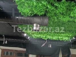Tətbiq nümunələri şəkillərdə: loft üslubunda kafe interyeri, ofis və tədris məkanlarında açıq rəngli kanallar, dekorativ yaşıl tavanla birlikdə işləyən hava xətti.