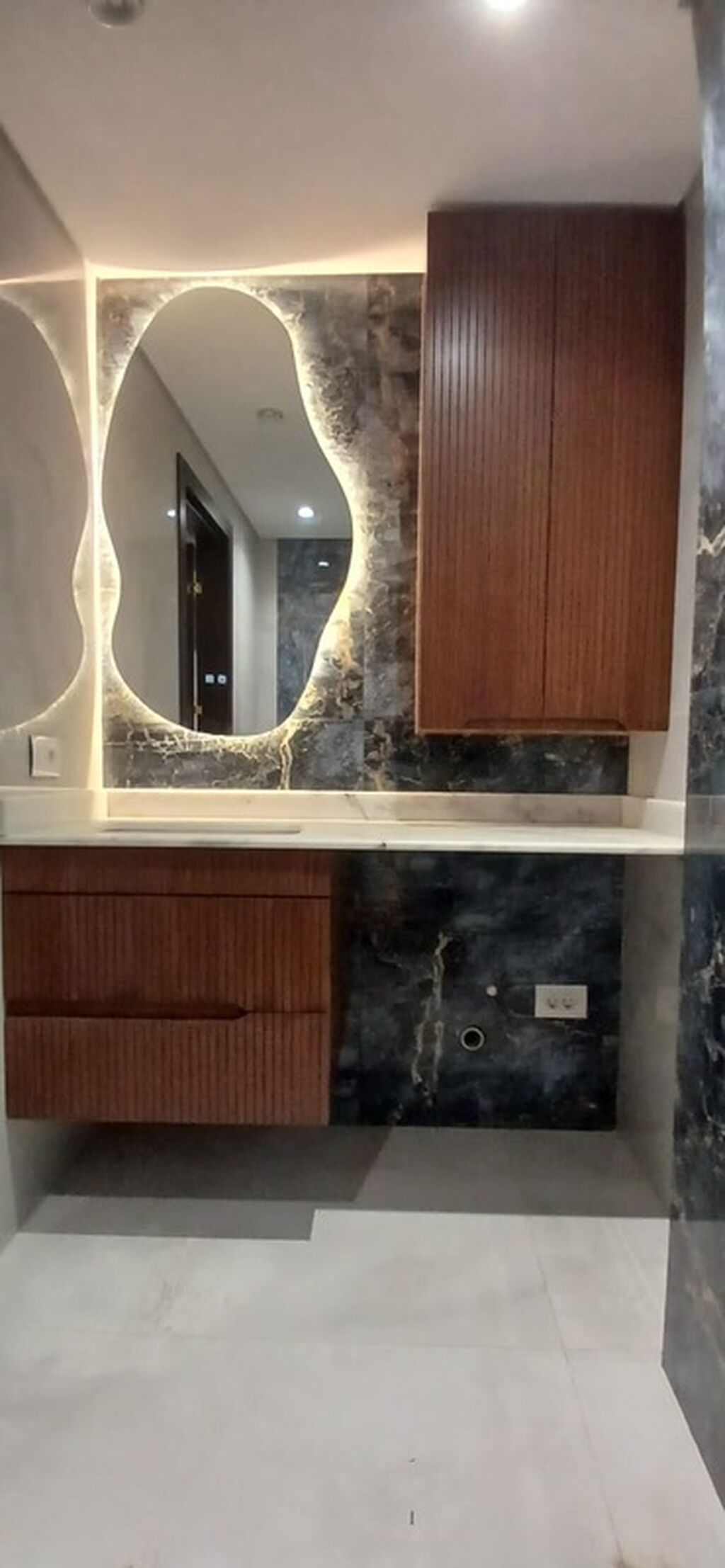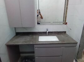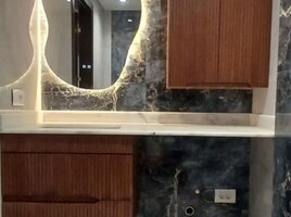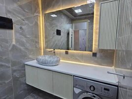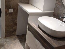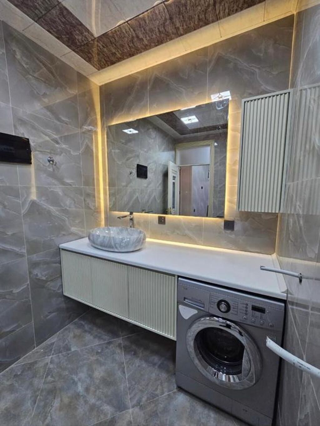 Mərmər effektli keramik plitələrlə üzlənmiş, müasir üslubda təmir olunmuş vanna otağı. Qara mat rəngdə duş başlığı və mikserlə təchiz olunmuş duş kabinəsi. Divara montaj edilmiş unitaz və qara rəngli aksesuarlar. Qara