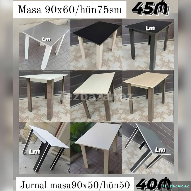 MASALAR . Yeni və sifarişlə . Qiymet: 45₼ . Masa 90x60/hün75 . Qiymət: 40₼ . Jurnal masa90x50/hün50 . Rəng seçimi sərbəst . Çatdırılma ödənişli