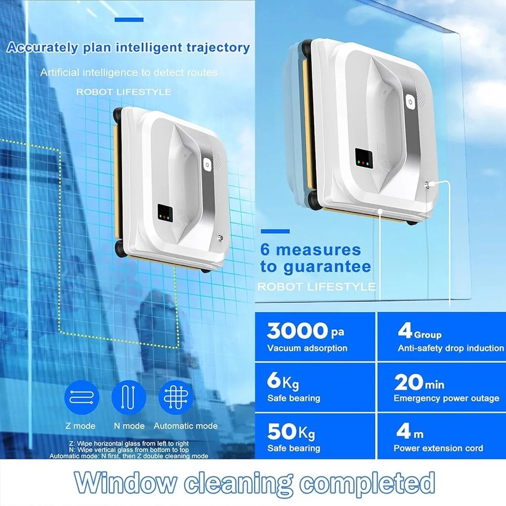 250*250*80mm ölçüləri olan Ağıllı Pəncərə Təmizləyici Robotumuz yığcam, lakin güclüdür. 80 Vt güc və 500 mAh batareya tutumu ilə DC24V nominal gərginlikdə işləyir. Təmizləyə biləcəyi minimum sahə 40*60CM-dir və elektrik kəsildikdən sonra 20 dəqiqəyə qədər adsorbsiyanı saxlaya bilir. Vakuum adsorbsiya texnologiyasından istifadə edir və düşmədən qorunma ilə gəlir.